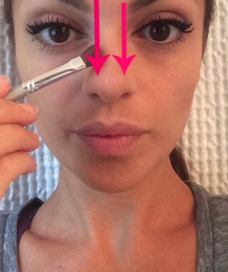Use a little product at a time. You can always add more, but once you overdo it, it’s not easy to correct. Swipe it down both sides of your nose and a little under the tip if you want to. Use your fingers or a clean brush to soften the lines and blend it in a bit. What the heck is that face I made? Oh well. lol!
