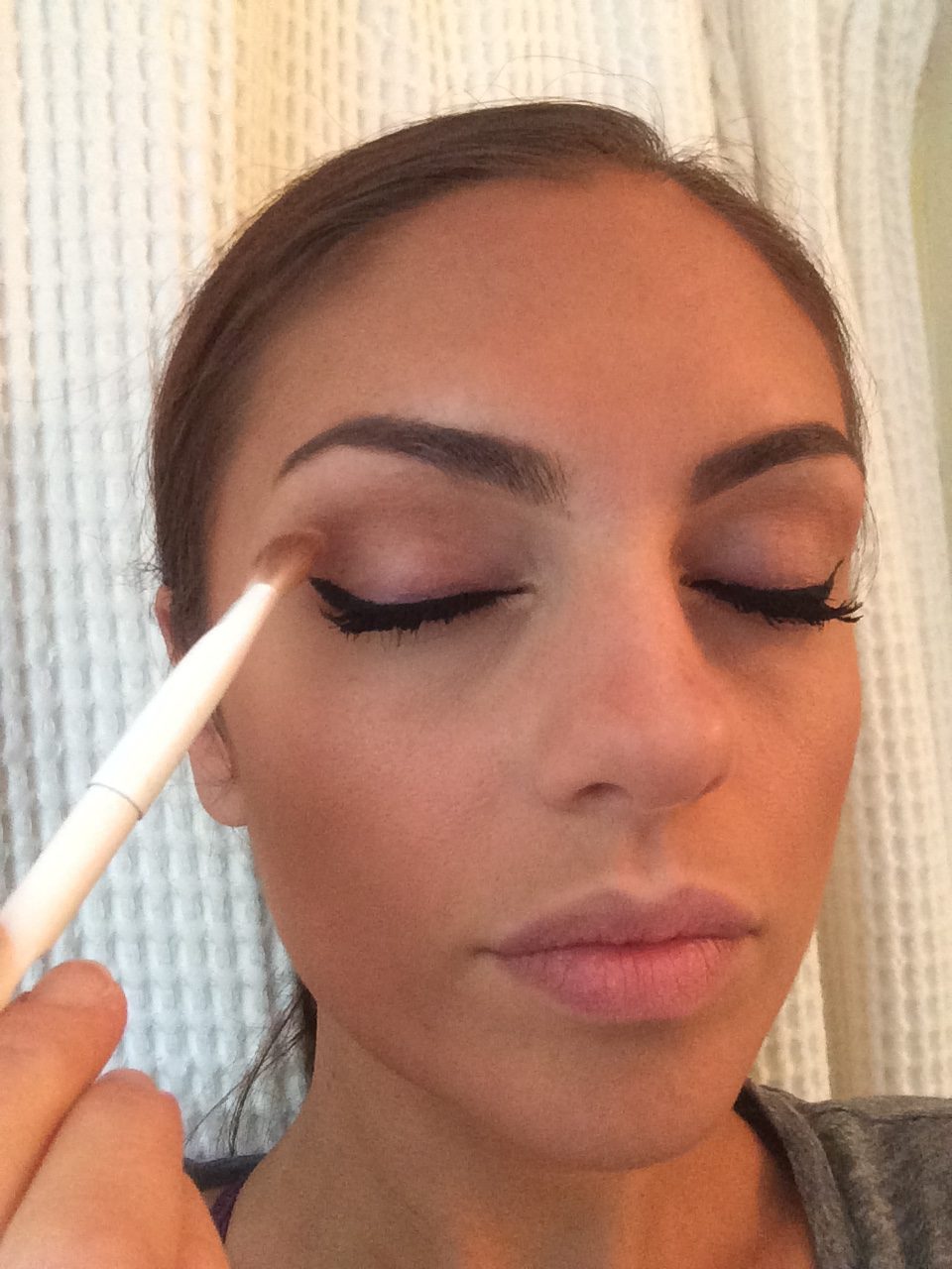 I use the Anastasia eye shadow in the shade Bling (a peach color with a satin finish) to highlight a thin line down the bridge of my nose. I don’t like to use actual highlighters on my nose because I find it looks too shimmery almost greasy. This color is perfect. I also used a touch under my brow bone.