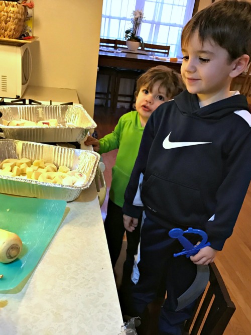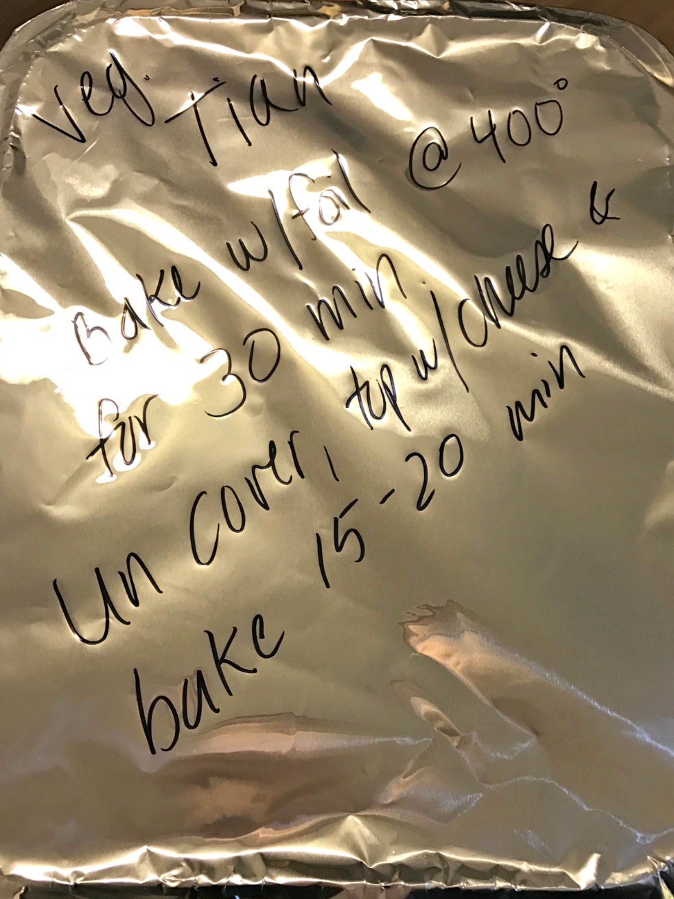 When I got home, I prepped as many of the side dishes as humanly possible. Best tip when cooking for a large crowd (besides prepping ahead) is to write the cooking instructions on the foil that covers it. Huge time saver.