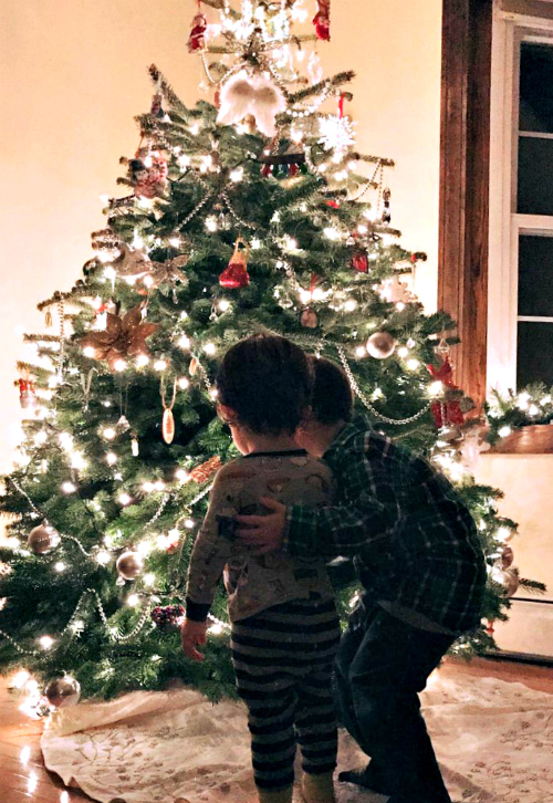 It was the first year my husband chose the tree. We snapped our annual family photo in front of it. You guys, Max hugging his baby brother is too much for me.