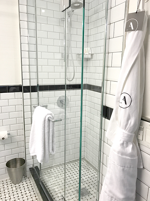 The little extras are what sets this hotel’s hospitality apart from other hotels I’ve stayed at. Frette robes for the duration of our stay were a luxurious touch. Minimalist toiletries and even makeup remover wipes (which were much appreciated) were provided in the bathroom. Peep the sweet beveled subway tiles.