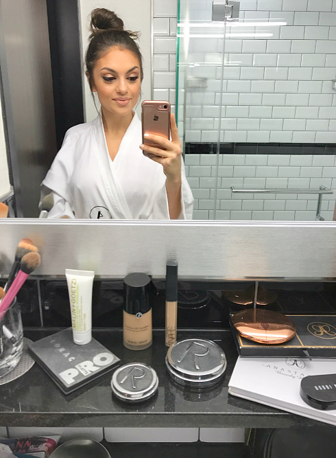 I was feeling pampered putting on my makeup in my spa robe (without a toddler weaving through my legs). What is it about an all white bathroom that instantly makes me starry eyed?