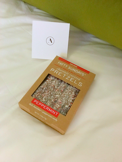 (Free) waters and handmade caramels, turn-down service with a box of chocolate peppermint covered pretzels (from a local shop), champagne, and a $20 Joker card (hotel credit at any of the bars/restaurants or valet). Every room has a Nespresso station fully stocked with creamer, pods and white cups -another nice touch.