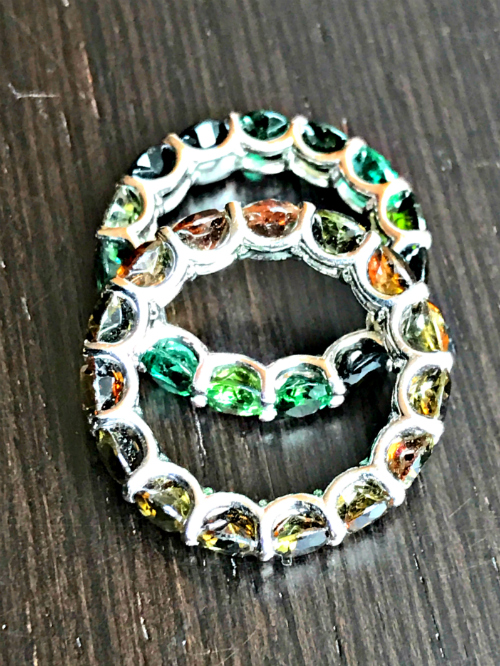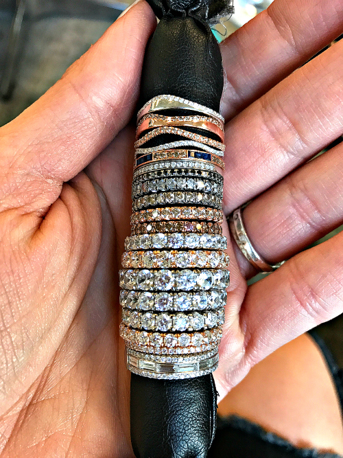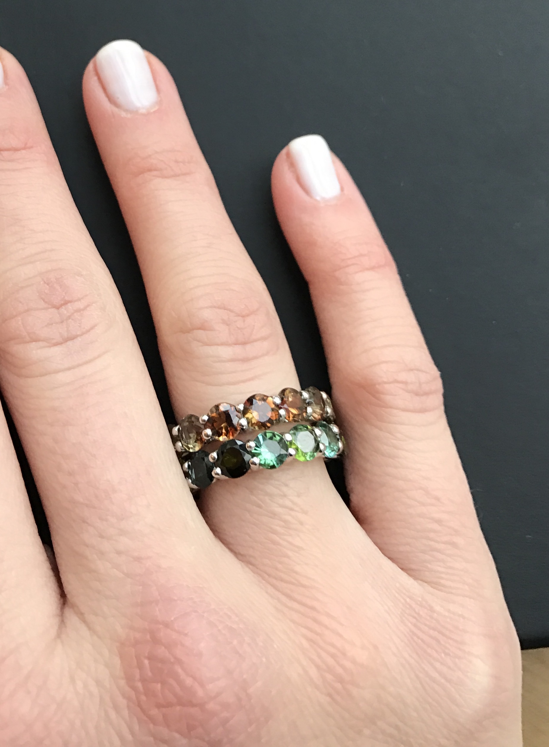 Helena chose a few colored gemstone bands and suggested stacking them. The amber hue eternity band features a rare but beautiful gemstone called andalucite, and the blue/green eternity band featuring green tourmaline. Check out how vibrant the colors are!
