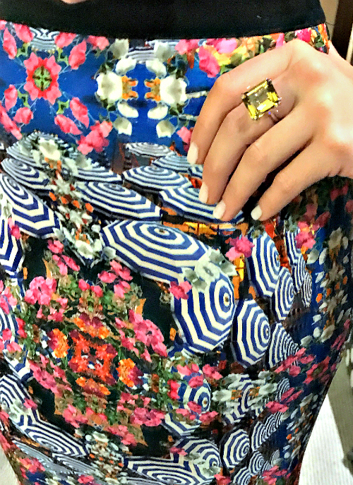 I wanted something funkier to pair with this brightly patterned Milly skirt. The yellow quartz Solutaire cocktail ring was just the ticket. How fun is this?!