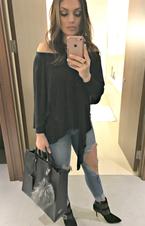 For my all black outfit, we thought a pop of color would work best. I wore the above quartz ring again because I was so in love with it and we added two bright bands to complete this look.
