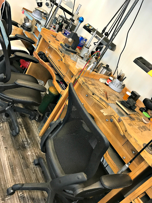 He cleaned my rings while the three of us discussed our families. They were SO down to earth and relatable. I felt like we were old friends having an easy conversation. David told me a little background information about his training and experience as a jeweler. Here’s more about him and his qualifications. There was a man at a bench working on a custom piece right behind us. I loved seeing the work space and the process. You could feel the creative energy in the room.