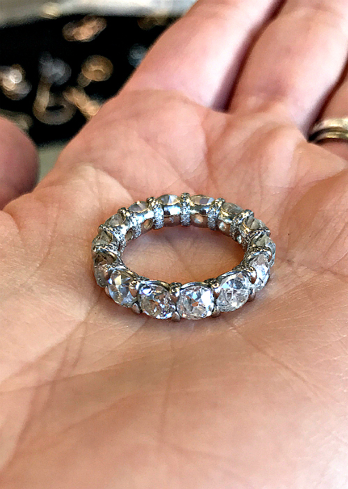 If you’re in the market for engagement or wedding bands, check out hers that came from this very workshop featuring 7.82 carats of old old-mine cut diamonds which are all 70-100 years old!… Those are diamonds on diamonds. Holy ice.