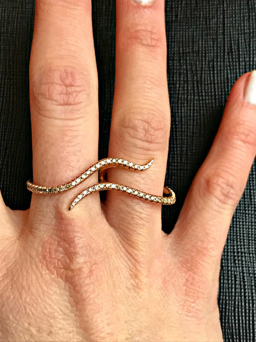 We decided that these two pieces from David’s Signature Collection were a great fit. The rose gold and diamond two-finger ring paired with the single midi-ring were the perfect choices.