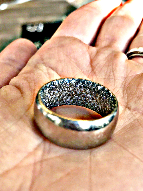 David showed me his wedding ring that he designed as well. Look at this one. Yes those are ombre grey colored diamonds on the inside of the band.