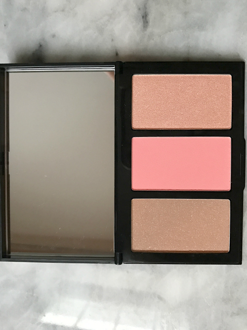 The Peach Palette is more of a pink than peach in comparison with the other cheek trio. I’d recommend this palette for fair to medium skin tones. The highlighter is a silky pink champagne color, the blush a pretty pastel peachy pink and the bronzer is light tan with subtle champagne color flecks. .