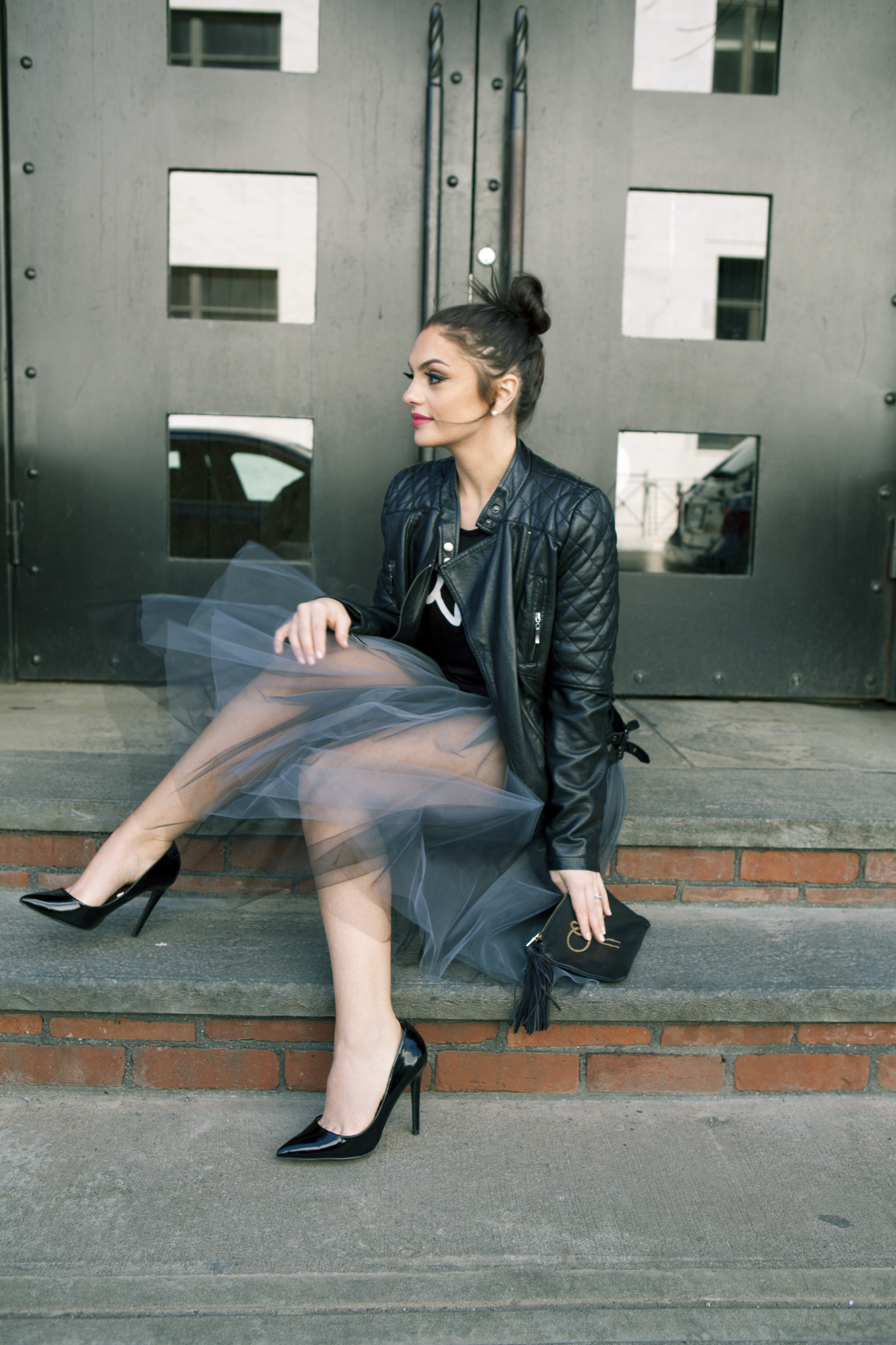 I put together this outfit based off of the skirt that was sent to me from Pink Sheep Heiress. The tulle is so girly and feminine but there is a toughness to it because the waistband is the most soft leather! The vibe felt like Madonna in her infamous Like A Virgin video, so I ran with that and added a moto jacket, punchy lips and glossy spiked heels. Okay, now I’m ready for a night out!