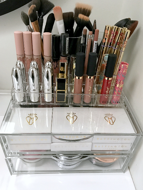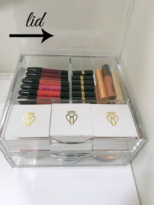 Boxy Girl must have known about my little problem because they sent me a pretty sweet setup to review (I wasn’t paid money to write this BTW, just a product sample was sent). It’s made out of clear lucite, so you can see what’s inside and it will match any interior decor. They sent me a double stack with a lid and the brush add on and lipstick add on.