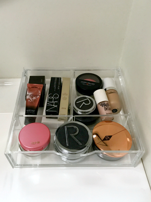 First I filled the base layer. I put my round compact products in it because these tend to make the biggest mess for me. Also I’m OCD about things like this (snap fam knows about my grocery OCD -grains with grains, dairy with dairy…).