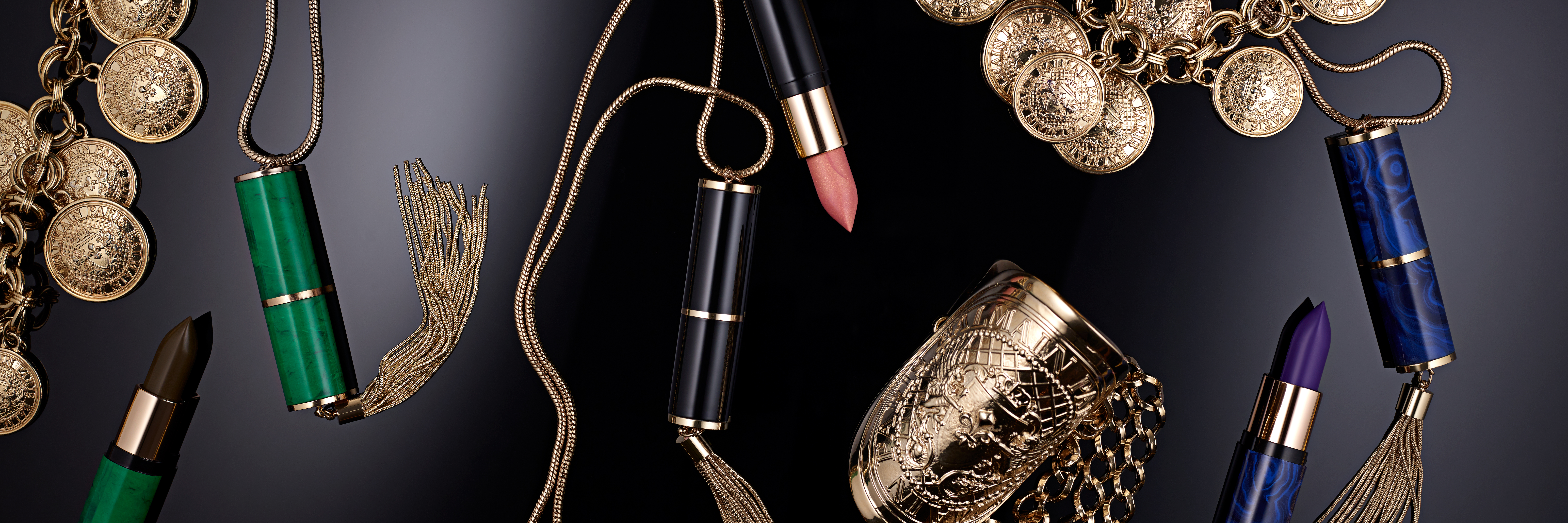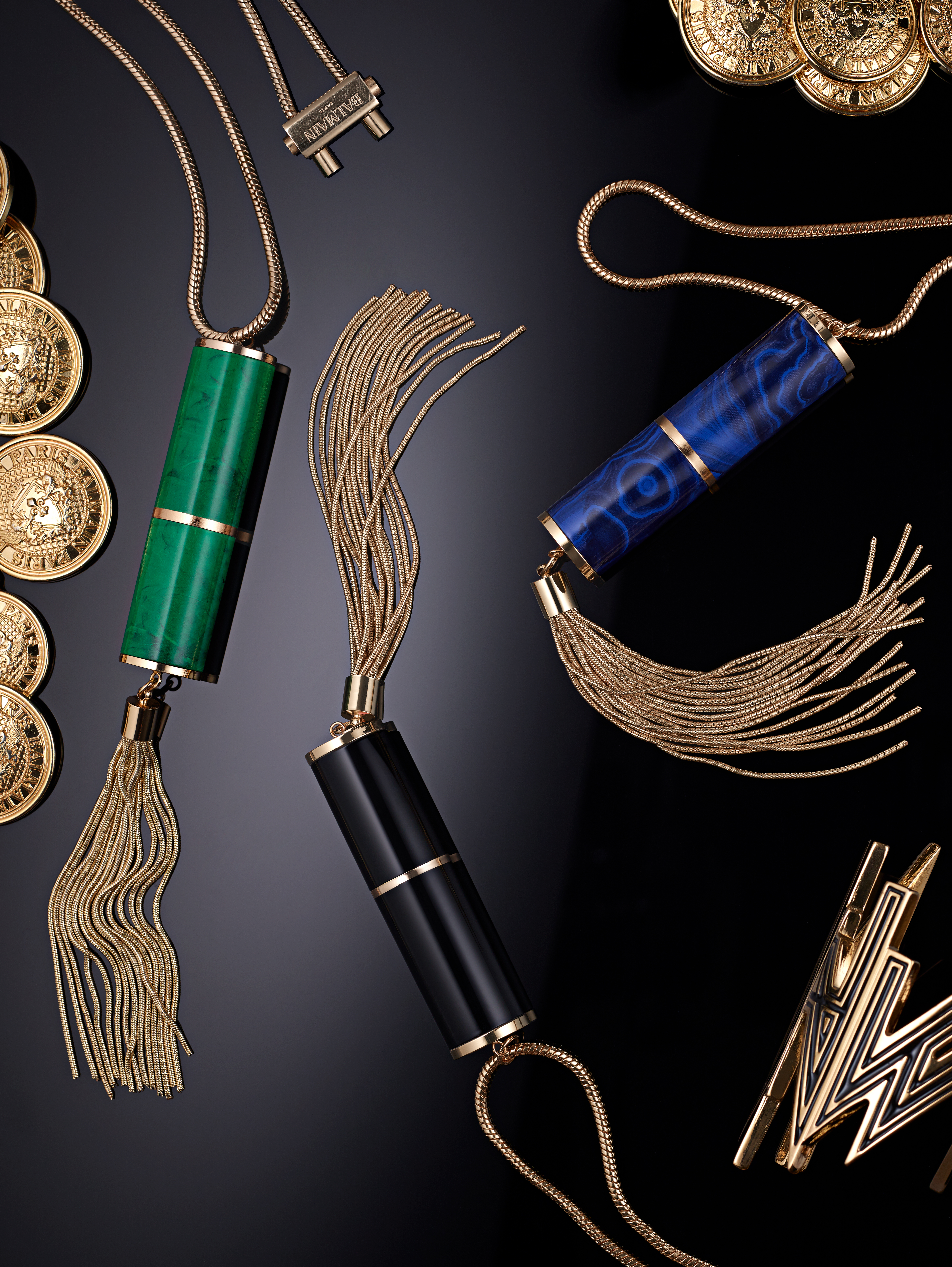 bejewelled pack design: marbled green, edgy malachite or onyx black and the house symbols of gold tassels and gold-toned metal –a signature color shared with L’Oréal Paris.