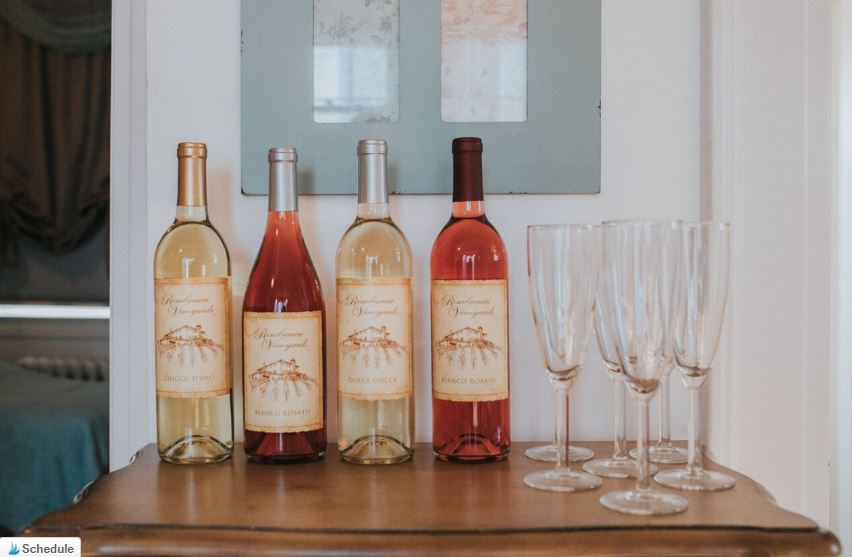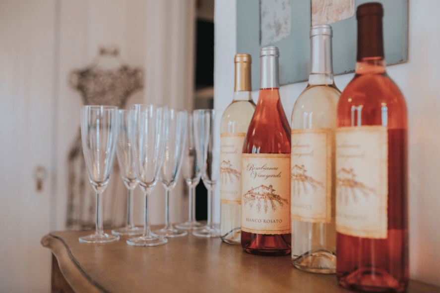 They purchased the property in Northford, CT almost 5 years ago. In the 1st year they remodeled the barn, for their tasting room and the house, took down the trees on the property in preparation to plant grapes and started making the first batch of commercial wines (Seyval Blanc, Pino Grigio, Cayuga, Moscato, a Rose, Primitivo, Sangiovese, Vino Del Nonno and Tre Uve). In addition, they planted the Cayuga grapes the next year and got the tasting room ready to open. Rosabianca opened the Tasting room January 2, 2015 and planted Seyval grapes that spring. In the next two years they have almost grown out of the small tasting room in the loft of the barn. Charlie built a patio in the spring of 2016, and introduced another 5 wines to the menu (Dolcetto, Rubino, Tramonto, a sweet Rose and a dry Rose). They just released two wines with grapes from the property. There is a limited amount of the estate grown Chicco D’Oro and Dolce Gocce. Rosabianca also has a new release coming out in May, so I super excited to try! They have plans to grow and in the next five years they hope to have a new tasting room built – the one depicted on the front of their bottles.